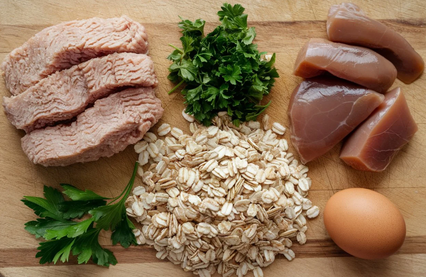 Take a large mixing bowl and combine the ground chicken, finely chopped or blended liver, oats, parsley, and the egg. Stir thoroughly until everything is evenly incorporated. If the mixture feels too soft or wet, just add a little more oats until it holds together nicely.