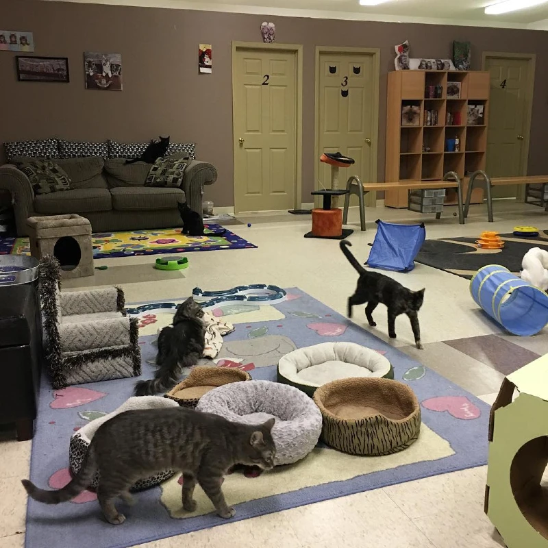 I like creating multiple rest zones when there’s more than one cat. In this setup, I use soft beds, tunnels, and open floor space so cats can choose where to relax or play.