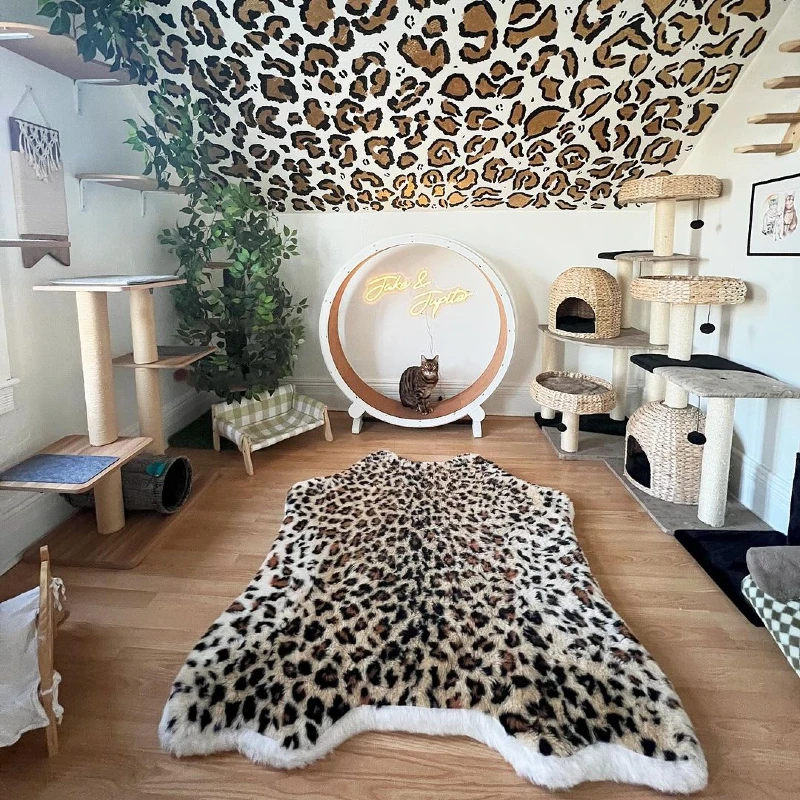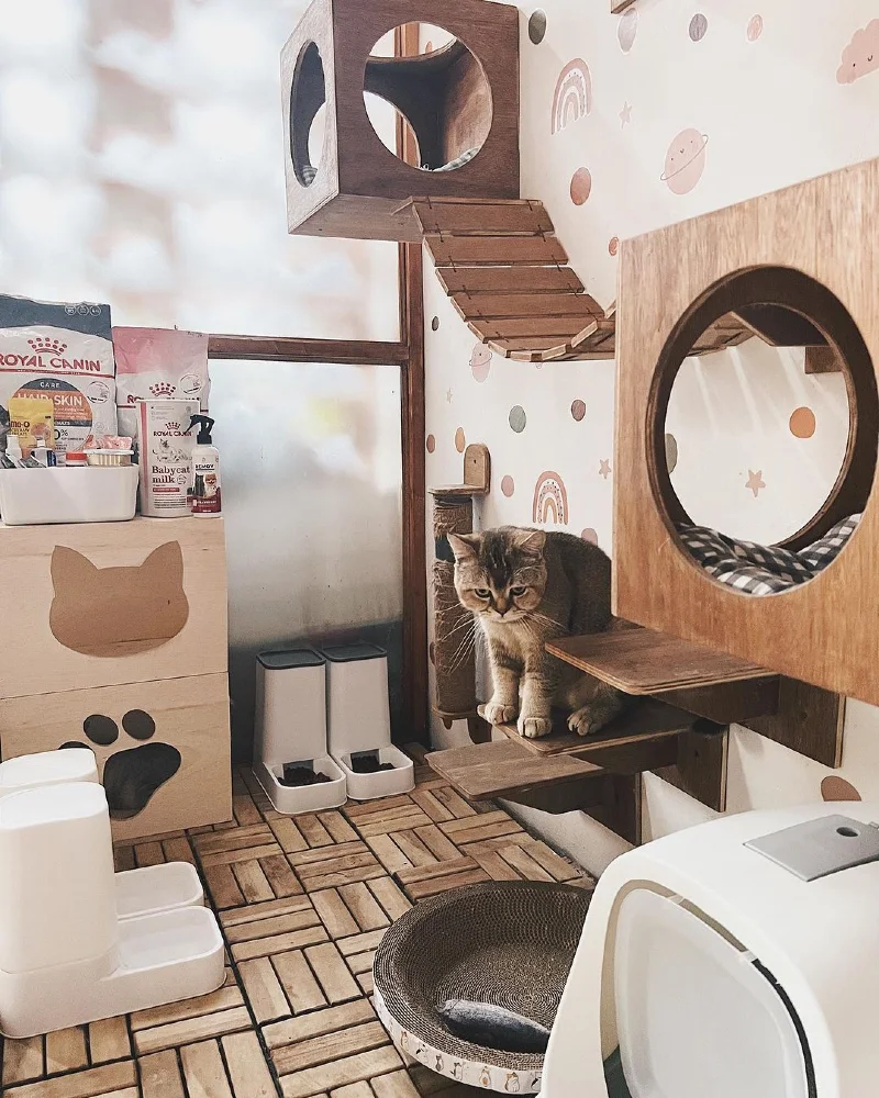 For high-energy cats, I like adding bold themes with lots of climbing options. Shelves, cat wheels, and scratch posts help mimic outdoor activity.