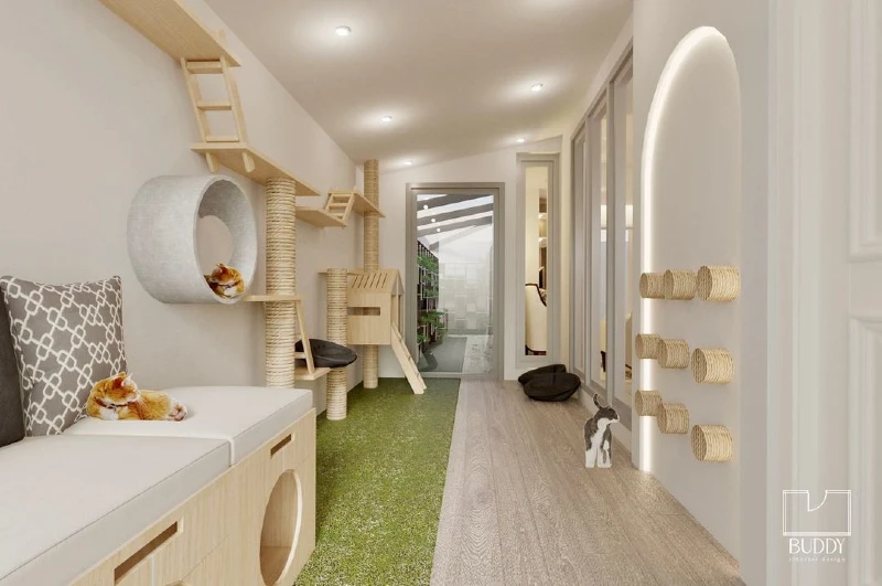 This is another design where I focus on clean lines and vertical movement. Wall platforms and scratch posts keep things functional without overcrowding the room.