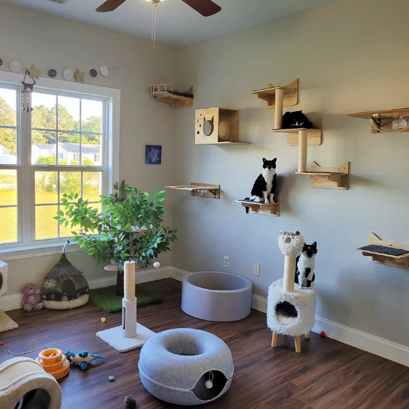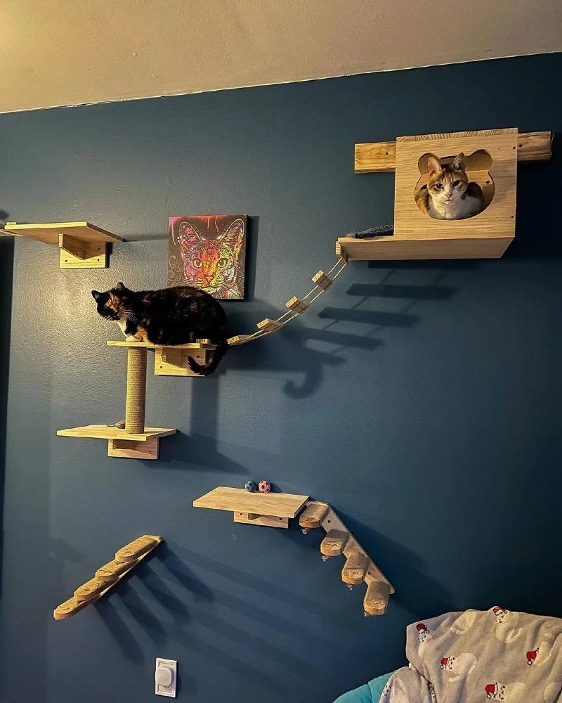 When I’m working with a small area, I focus on vertical solutions like wall-mounted cubes and bridges. This keeps the floor clean while still giving cats room to explore.