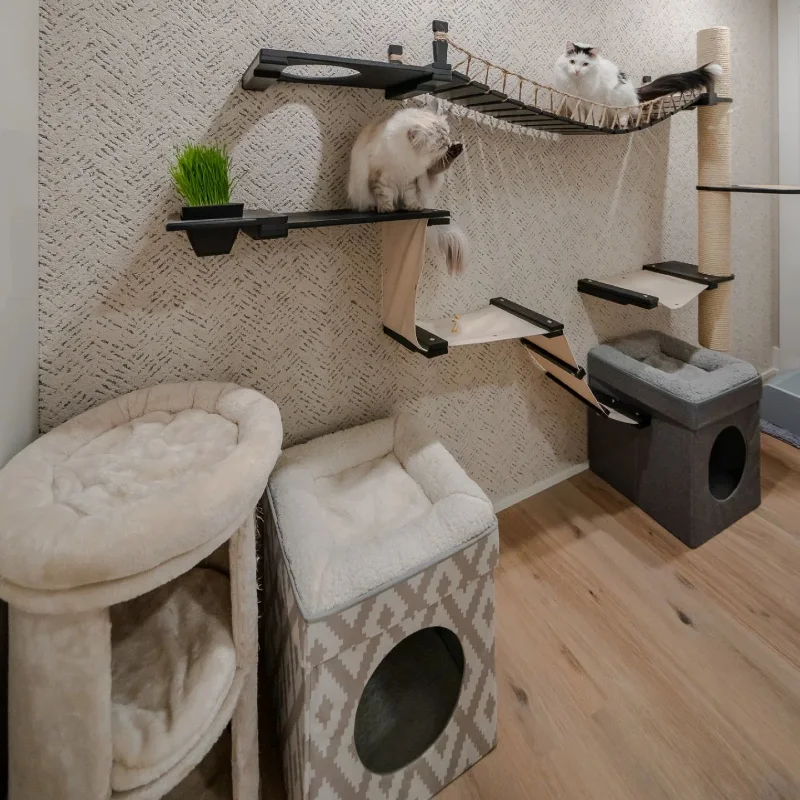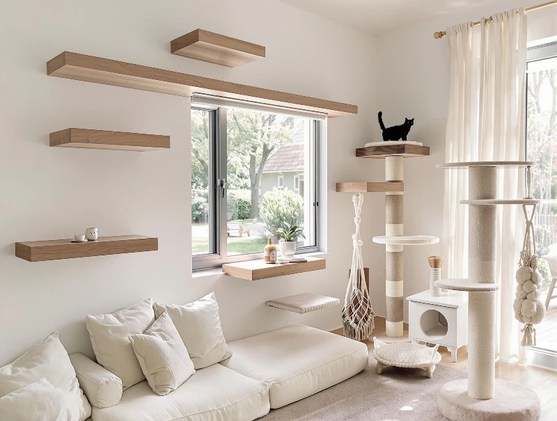 I like mixing climbing shelves with soft beds to create balance. Cats can play when they’re active and rest when they’re tired.