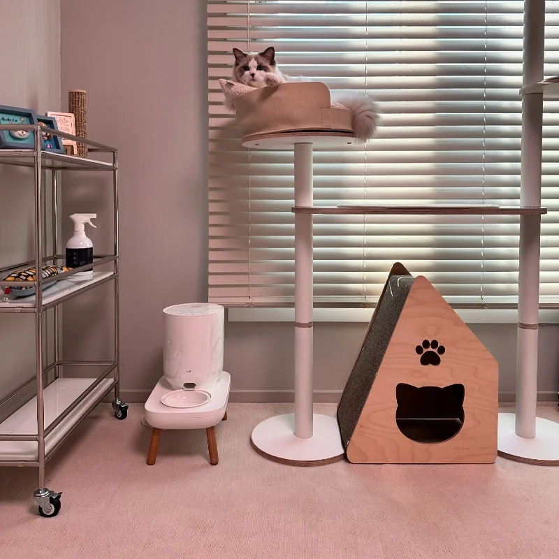 This setup focuses on simplicity and functionality. A tall cat tree, enclosed house, and organized feeding area cover all basic needs.