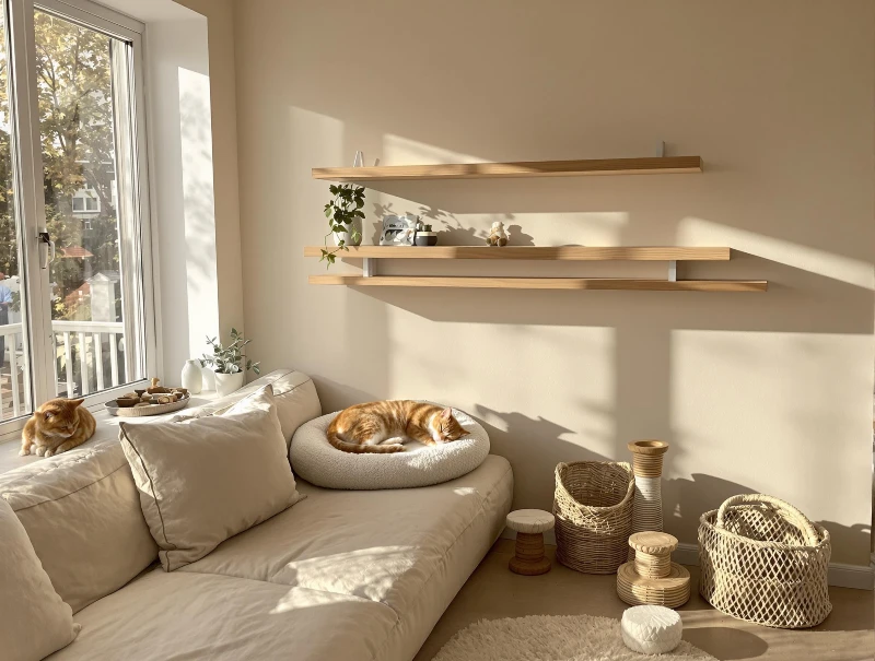 I like calm environments with soft lighting and natural materials. A simple sofa and a few shelves can be enough for relaxed cats.