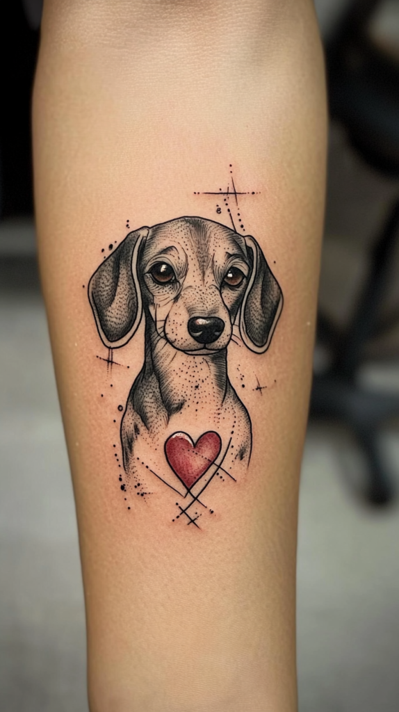 Express your love for your Dachshund by incorporating a heart into your tattoo design. Whether it’s placed near the dog’s face or integrated into the overall design, the heart adds a personal and emotional touch.