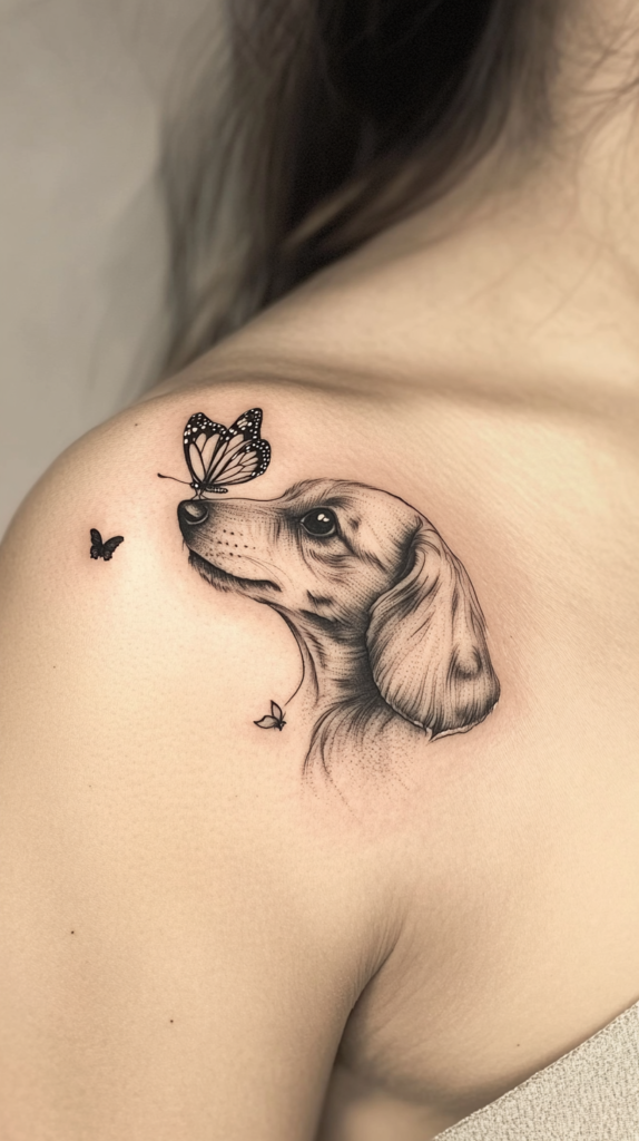Incorporate a butterfly into your Dachshund tattoo to add a touch of grace and transformation. The butterfly can symbolize new beginnings or the light-hearted nature of your pet.