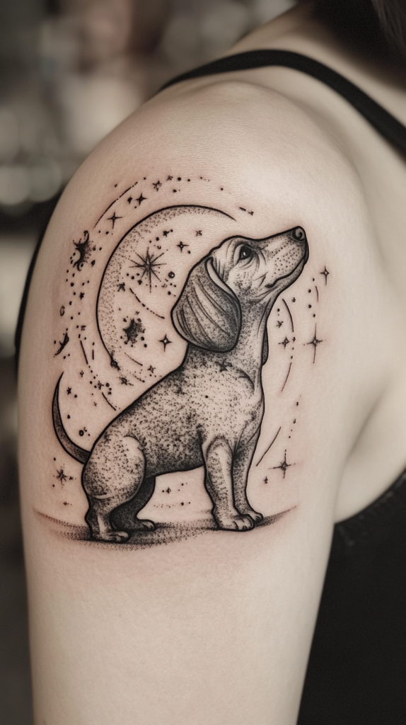 Add stars around your Dachshund tattoo to create a celestial theme. This design can represent your Dachshund as your guiding star or a special presence in your life.