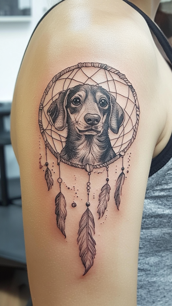 Combine a dreamcatcher with your Dachshund tattoo to create a unique and protective design. The dreamcatcher can symbolize your dog’s role as a protector and bringer of good dreams.