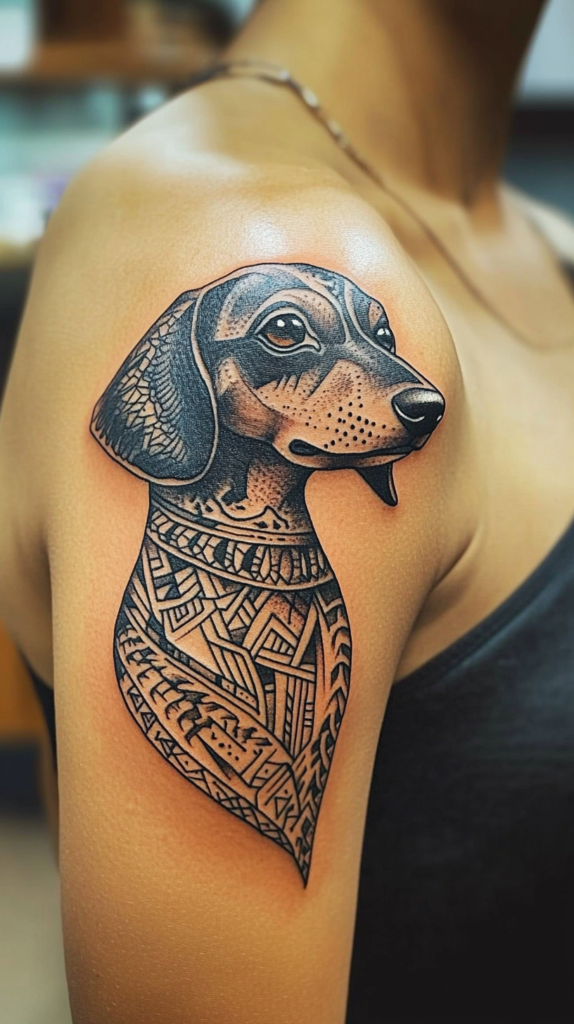 Incorporate tribal patterns into your Dachshund tattoo to give it a bold and powerful look. This style emphasizes the Dachshund’s strength and can be a great choice for a large, detailed piece.