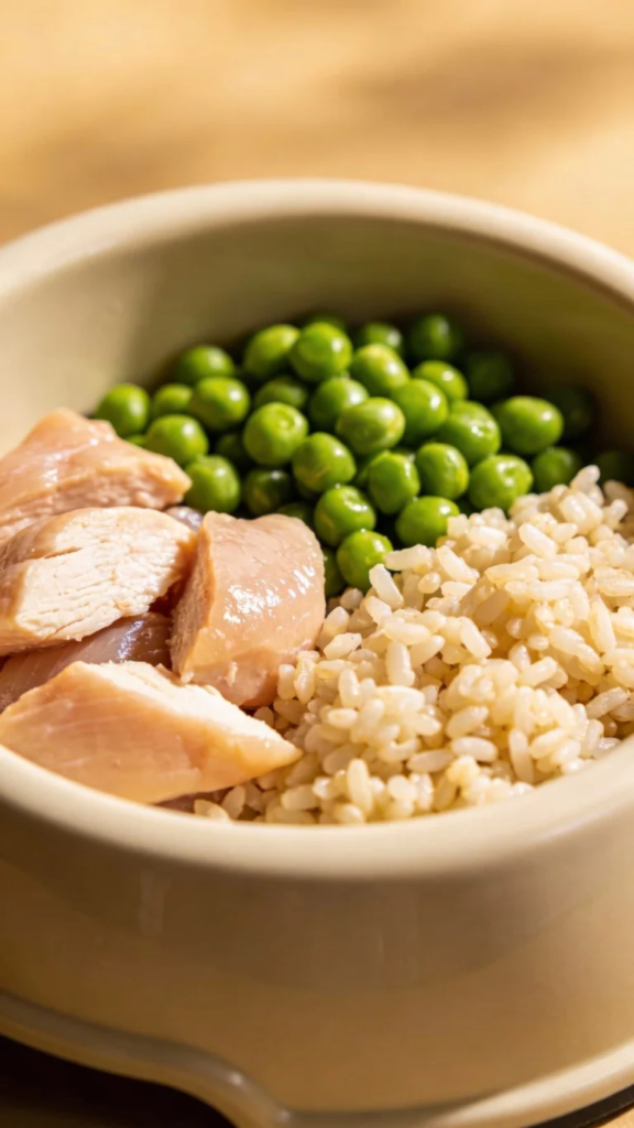Gentle on tummies, this recipe combines chicken, rice, carrots, peas, and olive oil. Perfect for picky eaters.