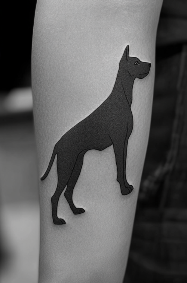 Sometimes simplicity speaks louder than detail. A silhouette tattoo captures the Doberman’s unmistakable shape. It’s clean, timeless, and instantly recognizable. You don’t need intricate shading to show the dog’s elegance—its outline alone tells the story.