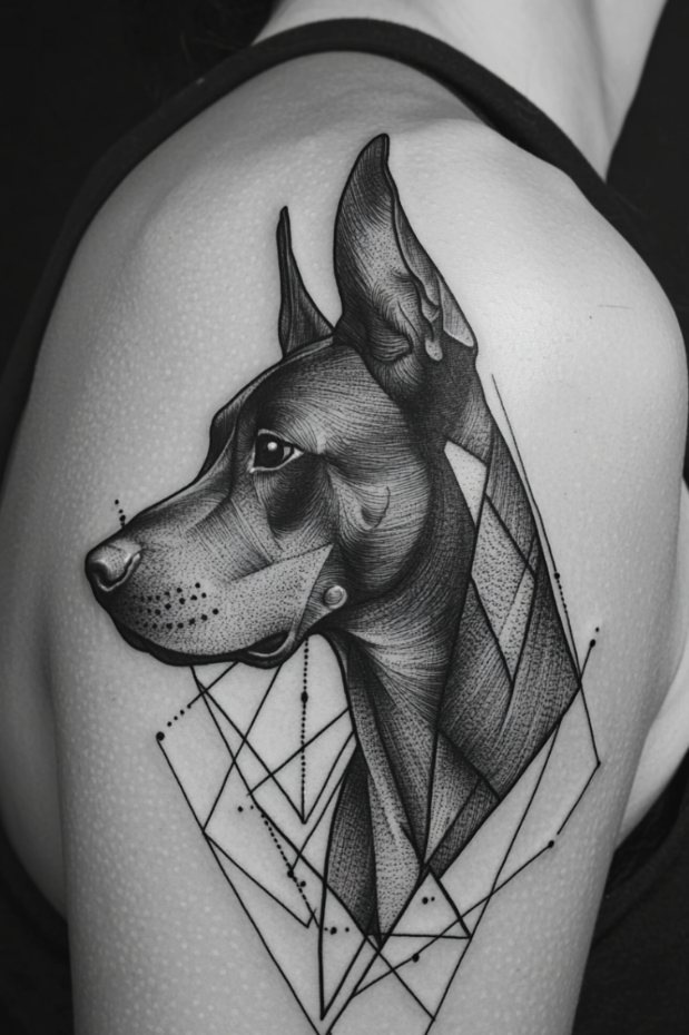 Geometric designs take a modern approach. Using triangles, lines, and shapes, artists can create a stylized Doberman that feels contemporary and edgy. It’s perfect if you want a tattoo that feels artistic but still clearly honors the breed.