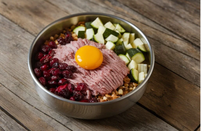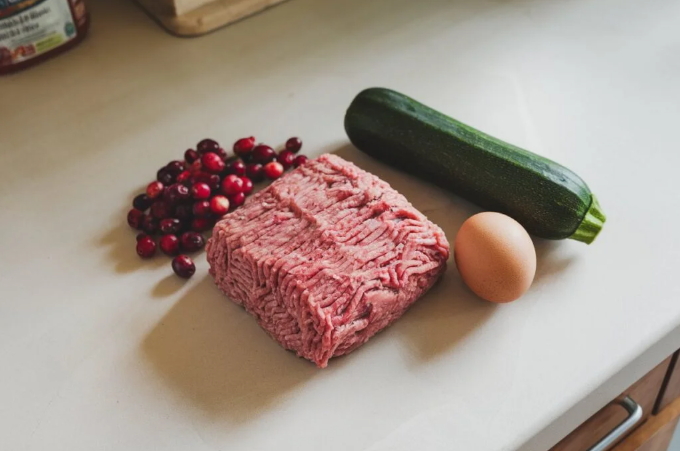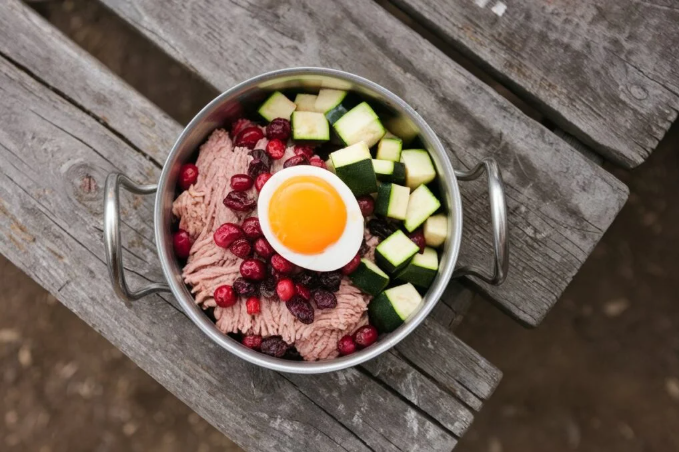 - Combine the Ingredients: In a large bowl, mix the duck, cranberries, zucchini, and cracked egg until well blended. Don’t worry if it looks messy—you’ll see that dogs don’t care; they just love the taste.