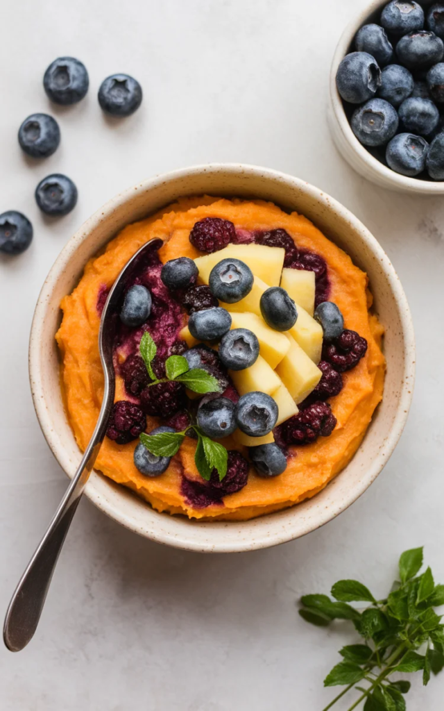 Sweet potatoes are highly digestible and packed with fiber and beta-carotene. Combined with blueberries, they create a naturally sweet, nutrient-dense mash that works well as a side dish or topper.