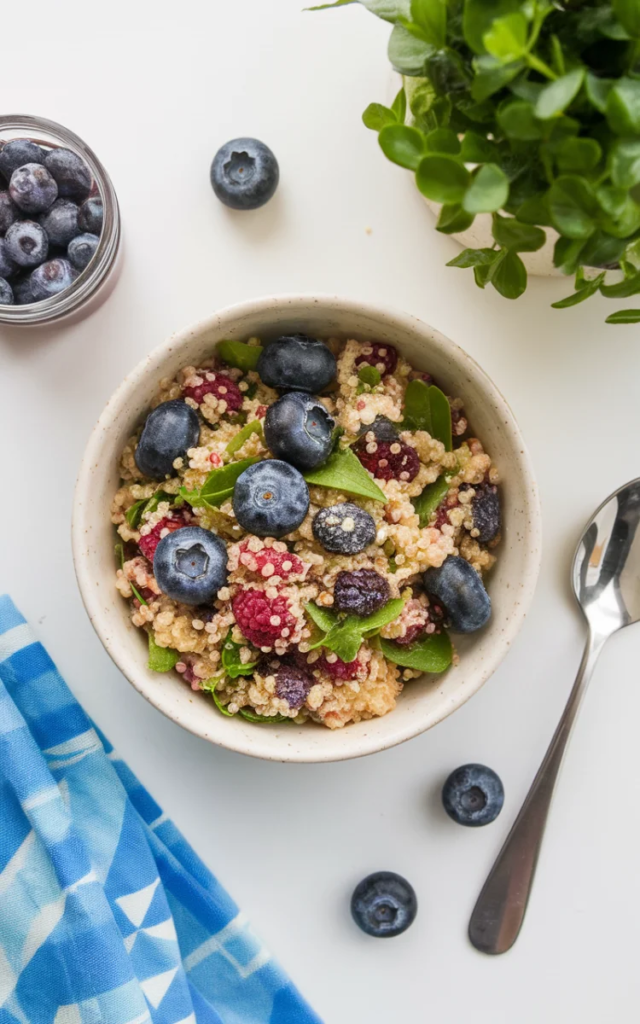 Quinoa is naturally gluten-free and provides plant-based protein. When combined with chicken and blueberries, it becomes a balanced, satisfying meal option.