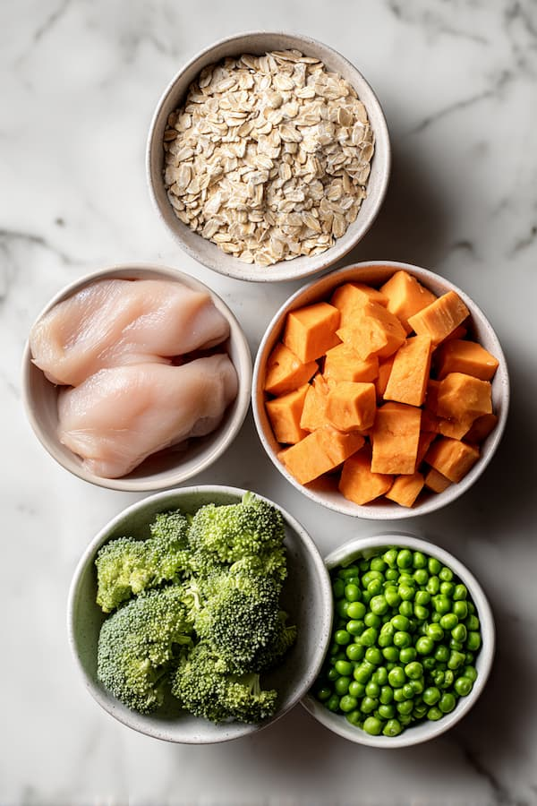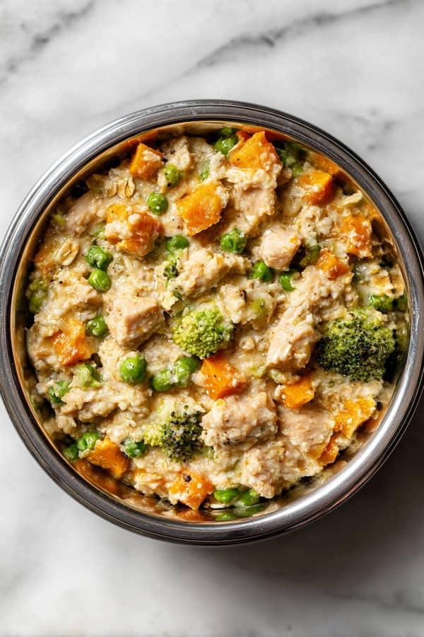 The first time I made this chicken and oatmeal recipe I kept it simple on purpose — chicken, oats, a few vegetables, one pot. No complicated steps, no specialty ingredients, nothing I’d have to order online. It came together faster than I expected and my dog ate every last bit of it.