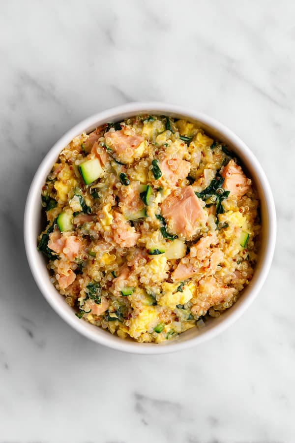 - Combine: Mix in quinoa and eggs, drizzle with fish oil.