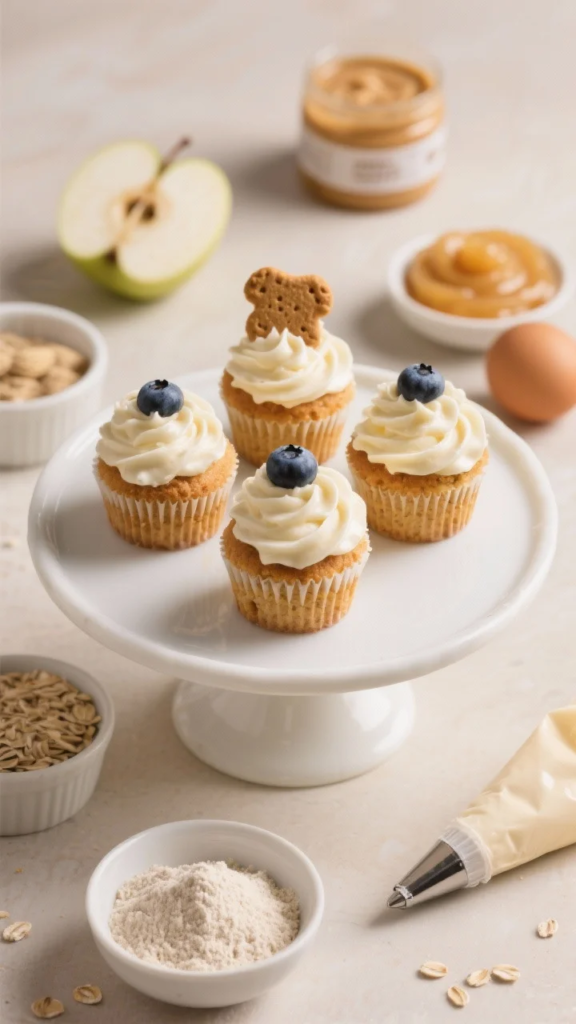 While the cupcakes cool, mix Greek yogurt and peanut butter until fluffy. Pipe or spoon the frosting on top and finish with a blueberry or mini dog biscuit. For pups who are sensitive to peanut butter, swapping in pumpkin works beautifully. These pupcakes freeze well for 2–3 months, so you’ll always have an emergency party treat ready.
