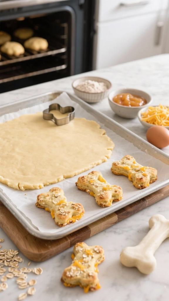 Preheat your oven to 350°F (175°C) and line a baking sheet with parchment. Mix the flour, oats, and cheddar, then add the applesauce and egg to form a dough. Add water gradually until the dough holds together. Roll to 1/4-inch thickness, cut into bone shapes, and bake 18–22 minutes until golden. For extra crunch, turn off the oven and let the biscuits dry inside for 30 minutes. Store them in an airtight container for up to a week or freeze for 3 months. Add a pinch of parsley for fresh breath or roll thicker and bake less for softer treats.