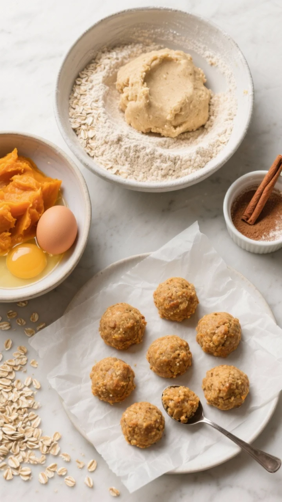Preheat your oven to 325°F (165°C) and line a baking sheet with parchment. Mix pumpkin, egg, and coconut oil. Add oat flour and drizzle in water until soft dough forms. Scoop into tablespoon portions, roll into balls, and gently flatten. Bake 12–15 minutes for soft bites or up to 20 minutes for firmer treats. Cool completely before serving. Store in the refrigerator for up to a week or freeze for 2 months. Break into smaller pieces for training or smaller dogs.
