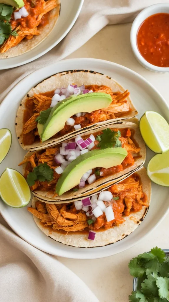 Chicken tinga tacos are smoky, spicy, and irresistibly flavorful. I love simmering shredded chicken in a sauce made from chipotle peppers in adobo, tomatoes, onions, and smoked paprika. It’s amazing how the chicken absorbs all the flavors. Serving it on warm corn tortillas with avocado and fresh cilantro makes each bite balanced and indulgent.