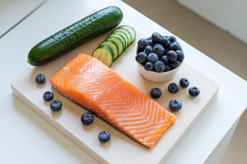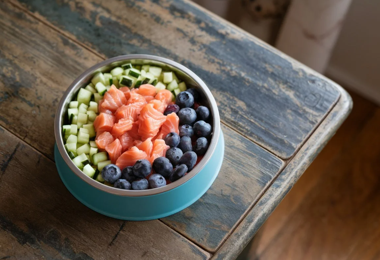 Salmon brings substance and nourishment without feeling heavy, while cucumber adds hydration and crunch that most dogs genuinely enjoy. The blueberries add a gentle sweetness and an extra nutritional layer, turning a simple bowl into something that feels thoughtful and intentional. This isn’t about overcomplicating meals — it’s about choosing ingredients that work together and support your dog’s body naturally.
