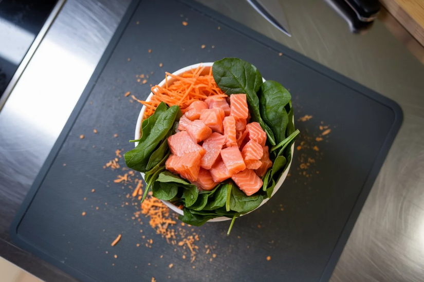 - In a large bowl, combine the salmon, spinach, carrots, and a tablespoon of ground flaxseed if you’re using it. Mix until everything is well blended.