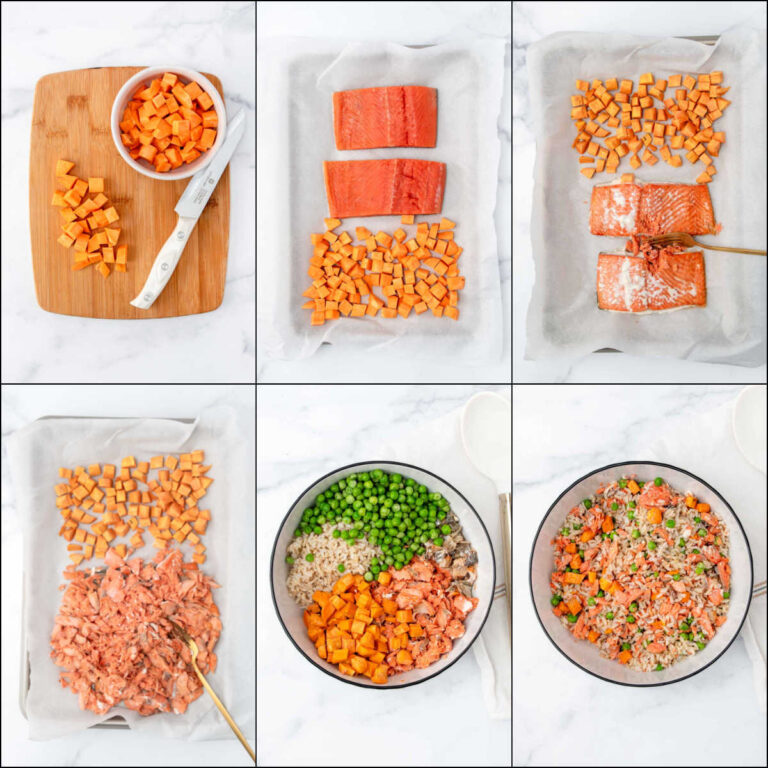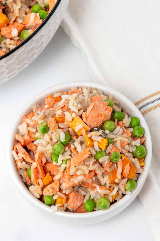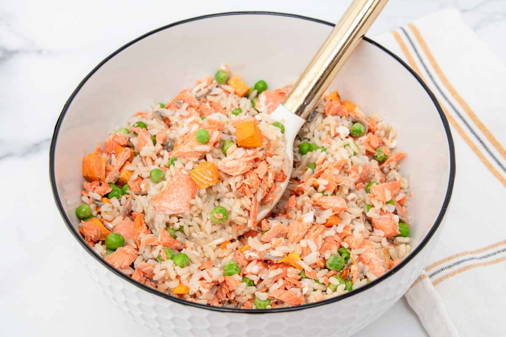 - Mix salmon, skin, sweet potato, cooked rice, and peas in a large bowl