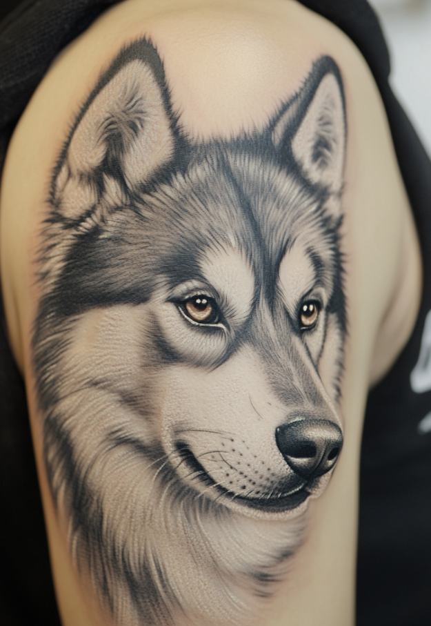 A realistic portrait tattoo can capture every tiny detail of your Husky’s face, from the expressive eyes to the texture of their thick fur. This style brings the dog to life on your skin, almost like they’re looking right at you. For someone who has shared years with their Husky, this kind of tattoo becomes a true tribute, preserving the personality and energy of your furry friend forever. You can choose a sitting pose, a playful stance, or even a close-up of their striking eyes to make the portrait incredibly personal.