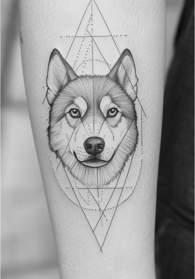 Geometric tattoos take a creative approach, combining sharp lines and shapes to form the image of a Husky. Triangles, circles, and abstract shapes can give a modern, edgy feel to the design while still clearly representing the dog. This style works well if you want your tattoo to feel contemporary and artistic rather than traditional, and it allows for bold visual experimentation with symmetry and color.