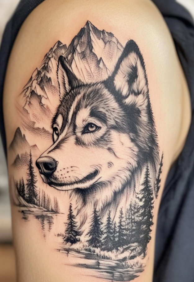 Adding mountains to a Husky tattoo emphasizes their deep connection with the outdoors. This design shows the breed in its element, adventurous and free in natural settings. It’s perfect for people who enjoy hiking or exploring alongside their Husky, and it gives a sense of freedom and boundless energy that reflects the dog’s true personality.