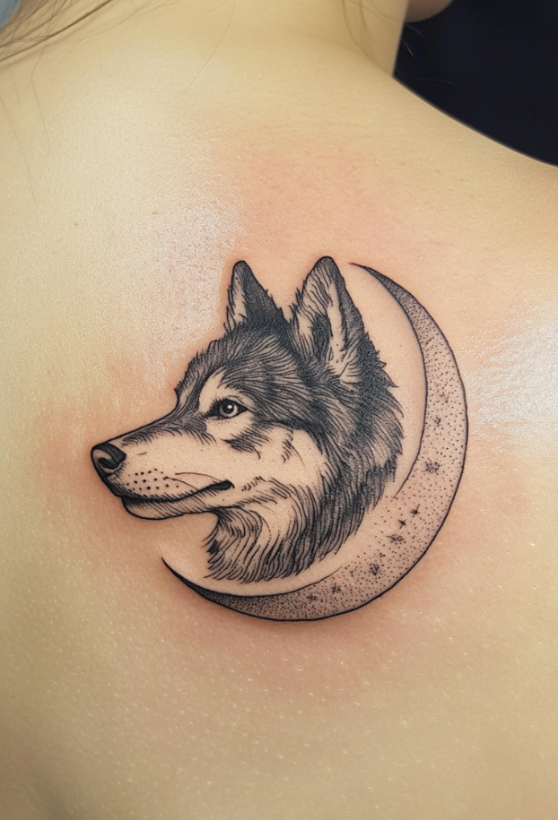 Pairing a Husky with a crescent moon creates a serene and mystical look. The moon adds symbolism, representing guidance, loyalty, and the protective presence of your dog. This design can evoke nighttime walks, quiet companionship, or the mystical aura Huskies seem to carry when gazing into the distance.