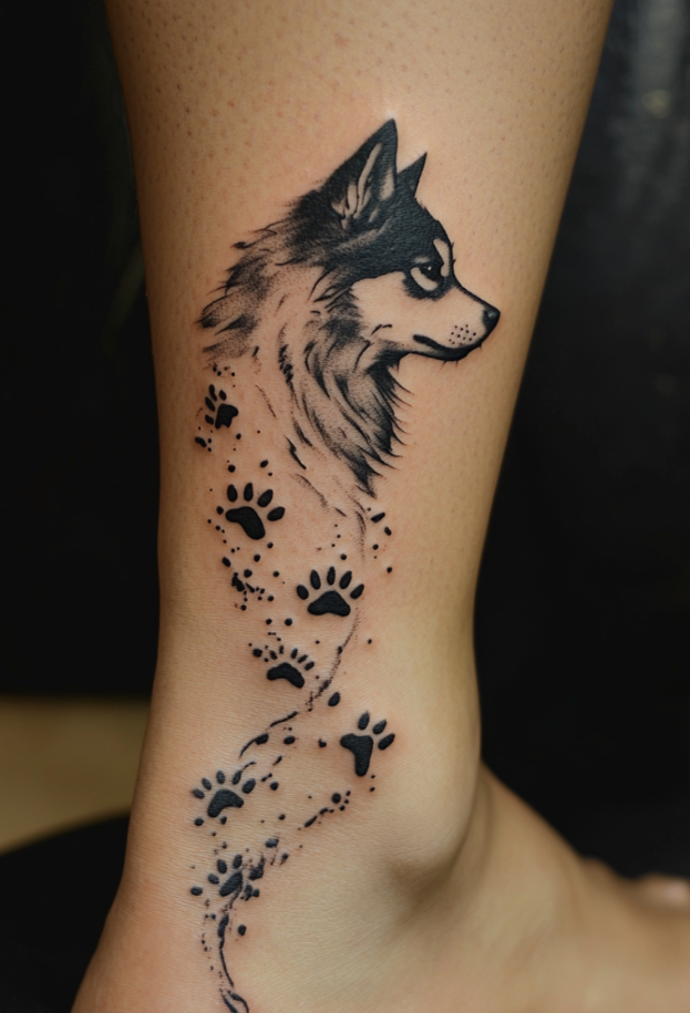 Adding paw prints gives the tattoo a personal touch. Each print can represent a step in your journey with your dog or simply celebrate the bond you share. They can trail along your arm or leg, giving the impression of movement and playfulness. This design feels intimate and joyful, reminding you daily of the adventures and memories shared.