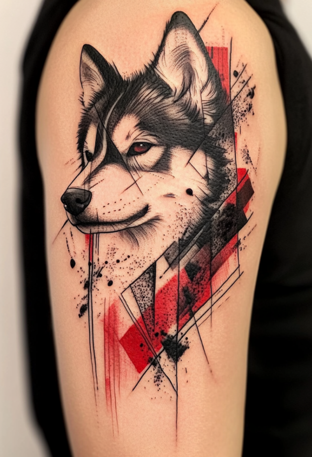 Abstract Husky tattoos allow for a more creative interpretation of the breed. Shapes, patterns, and bold color choices transform the dog into an artistic statement while still maintaining its recognizable features. It’s a great choice if you want your tattoo to stand out and reflect both the energy of the breed and your unique style.