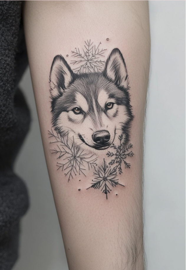 Snowflakes are a natural companion for a Husky tattoo. They highlight the breed’s love for cold weather and their natural Arctic origins. Snowflakes can be delicate and intricate, adding elegance to the design while celebrating the wintery environments Huskies thrive in. It creates a sense of harmony and beauty in the tattoo.