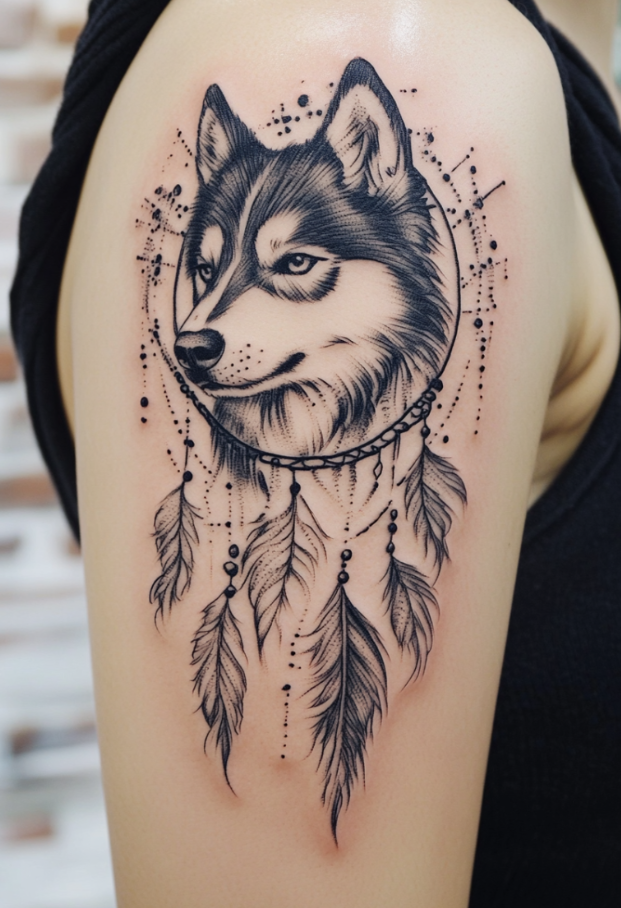 Combining a Husky with a dreamcatcher adds symbolism of protection, guidance, and positivity. The intricate web of the dreamcatcher paired with your dog can feel spiritual and protective, reminding you that your Husky is more than just a pet—they’re a loyal guardian and constant companion.
