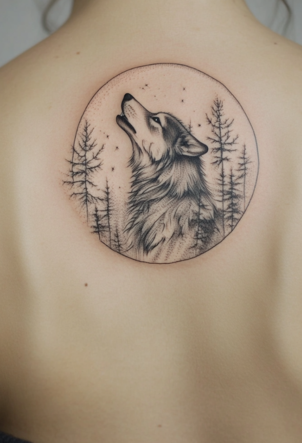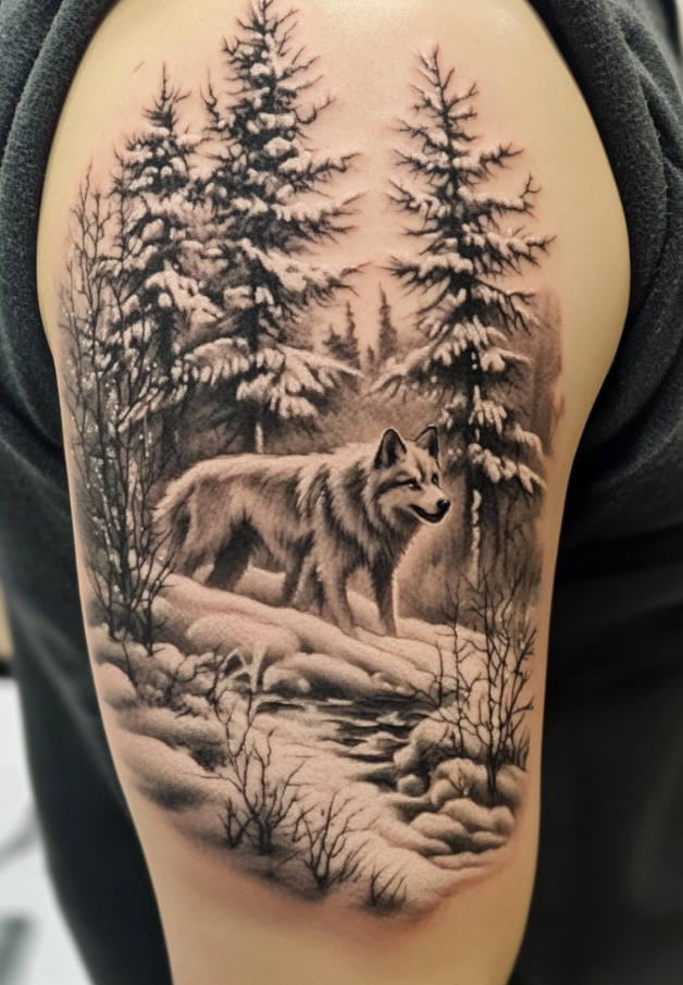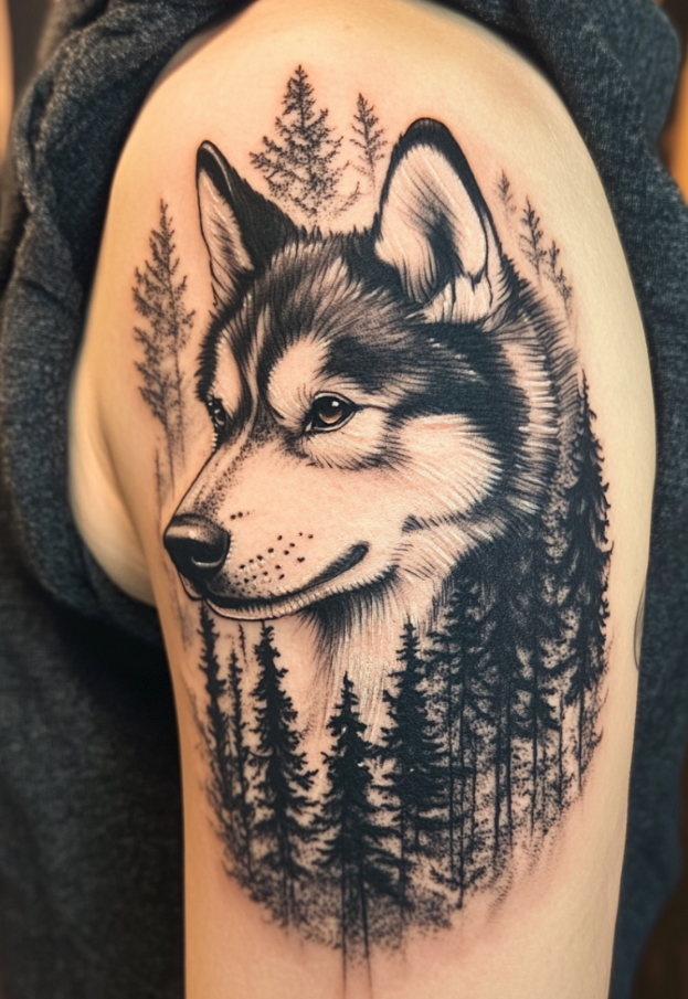 A forest backdrop emphasizes a Husky’s adventurous, nature-loving side. It gives the tattoo depth and context, showing the dog in an environment that mirrors its energetic and free-spirited personality. This design feels grounded, natural, and connected to the wilderness.