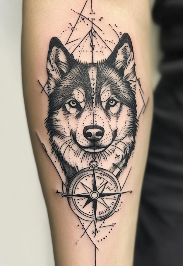 A compass symbolizes direction, guidance, and adventure—qualities Huskies embody perfectly. Adding this element to your tattoo reflects their natural sense of exploration and your shared adventures, making it both meaningful and visually appealing.