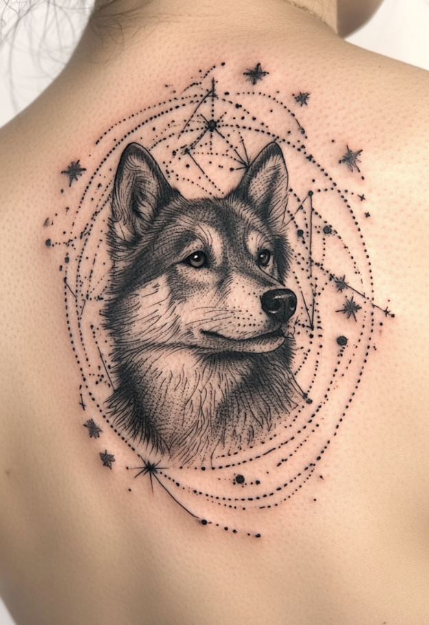 Stars can give a Husky tattoo a celestial touch. They can symbolize your dog as a guiding light or a special presence in your life. This design feels magical and personal, adding an otherworldly charm that pairs beautifully with the Husky’s natural mystique.