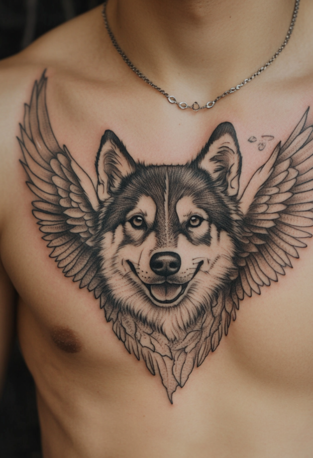 Angel wings transform a Husky tattoo into a memorial piece, perfect for honoring a pet that has passed. This design carries emotional weight, representing love, protection, and the idea that your Husky continues to watch over you, adding spiritual depth to your tattoo.