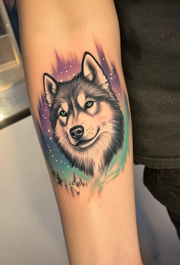 Incorporating the Northern Lights evokes the Arctic environment where Huskies originate. The vibrant colors of the aurora paired with the dog create a mesmerizing and magical tattoo that celebrates both beauty and natural habitat.