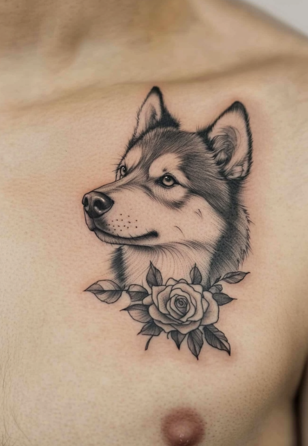 Pairing a rose with a Husky blends strength and beauty. The rose symbolizes love and delicate beauty, while the Husky represents loyalty and energy. Together, they create a visually appealing and meaningful composition.